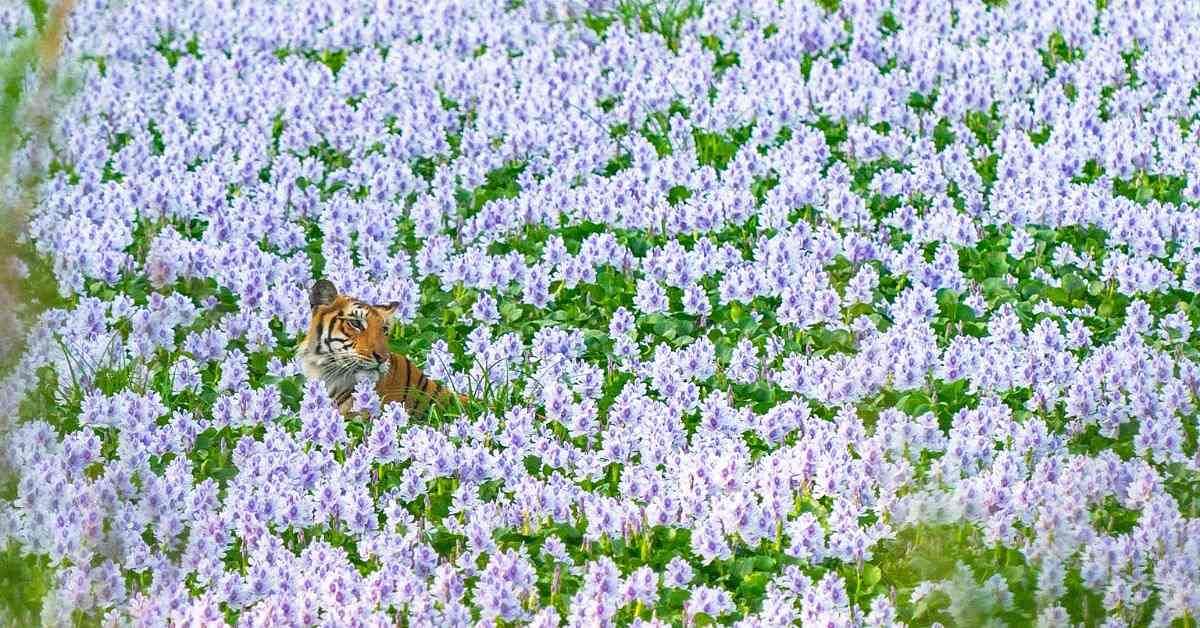 Clicked by photographer Sanjay Nair in the Pilibhit Tiger Reserve, Uttar Pradesh, the shot focuses on the beast against a backdrop of water hyacinths. Nair’s intent behind this particular shot was to convey the nature of the invasive plants, which are notorious for displacing native plant species within water bodies while reducing oxygen levels. “As seen in the image, even protected areas like national parks and tiger reserves are not immune to their impacts,” he notes.