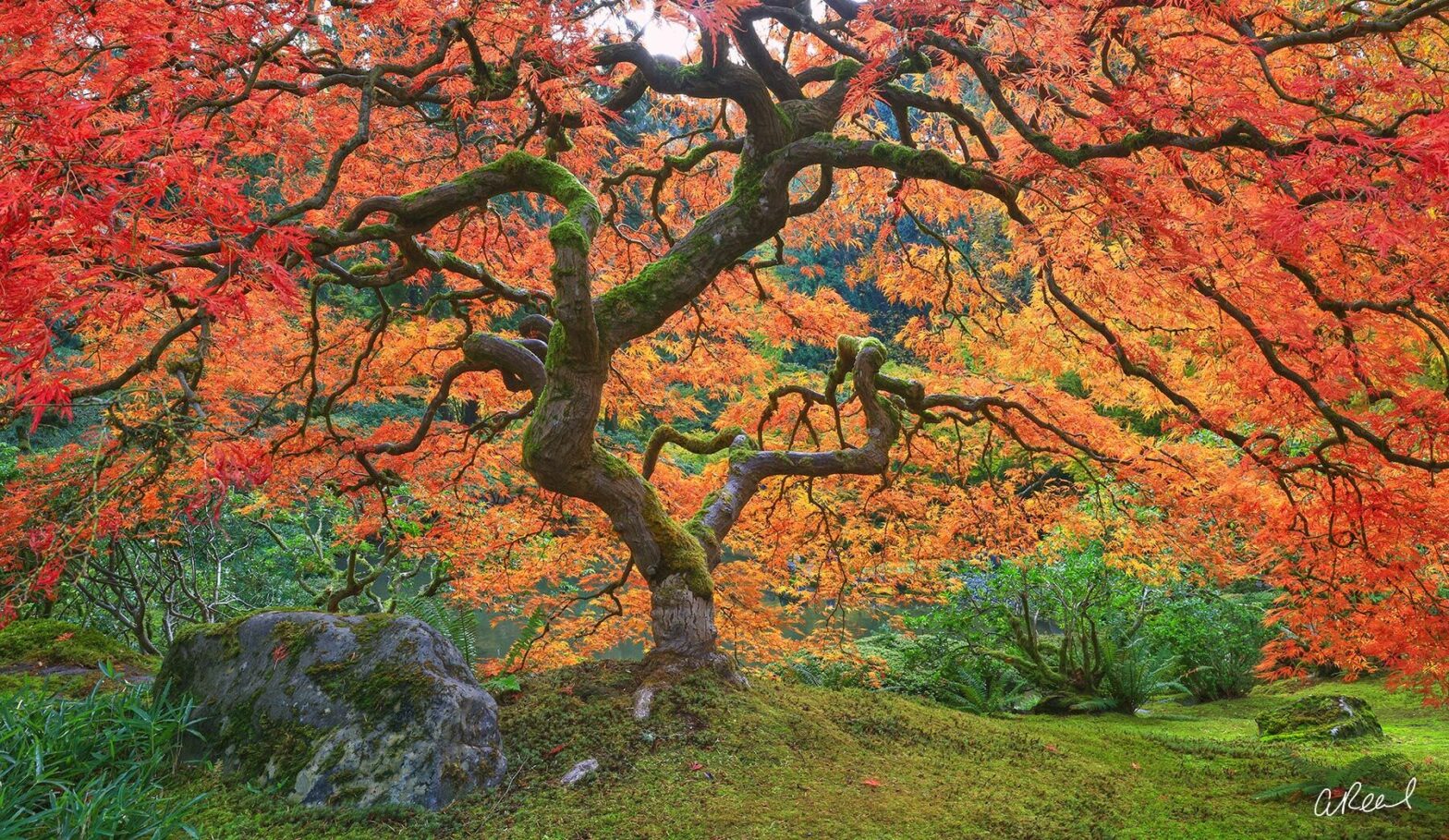 Nebulas of scarlet stars erupt from the twisted branches of an old Japanese maple in a garden in Portland, Oregon. A brilliant flash of fire, the autumn boughs make the surrounding beds of moss seem almost to glow. Fine Art Limited Edition of 200.