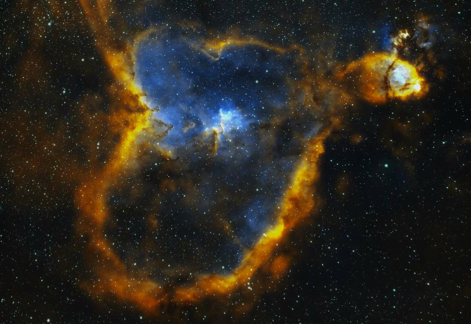 Further out again we find two nebulae in the constellation, Cassiopeia.Graham said: “The first is the Heart Nebula and is one of the most beautiful nebulae that I have had the pleasure to image. The Heart Nebula is some 7,500 light years from earth and is in the Perseus Arm of our Milky Way Galaxy. “In this narrowband image the blue colour is ionised oxygen and the orange colours from ionised sulphur gases.”