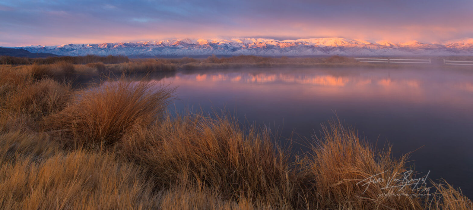 Sunrise over the fish lake hot springs with a view of the snowy white mountains.