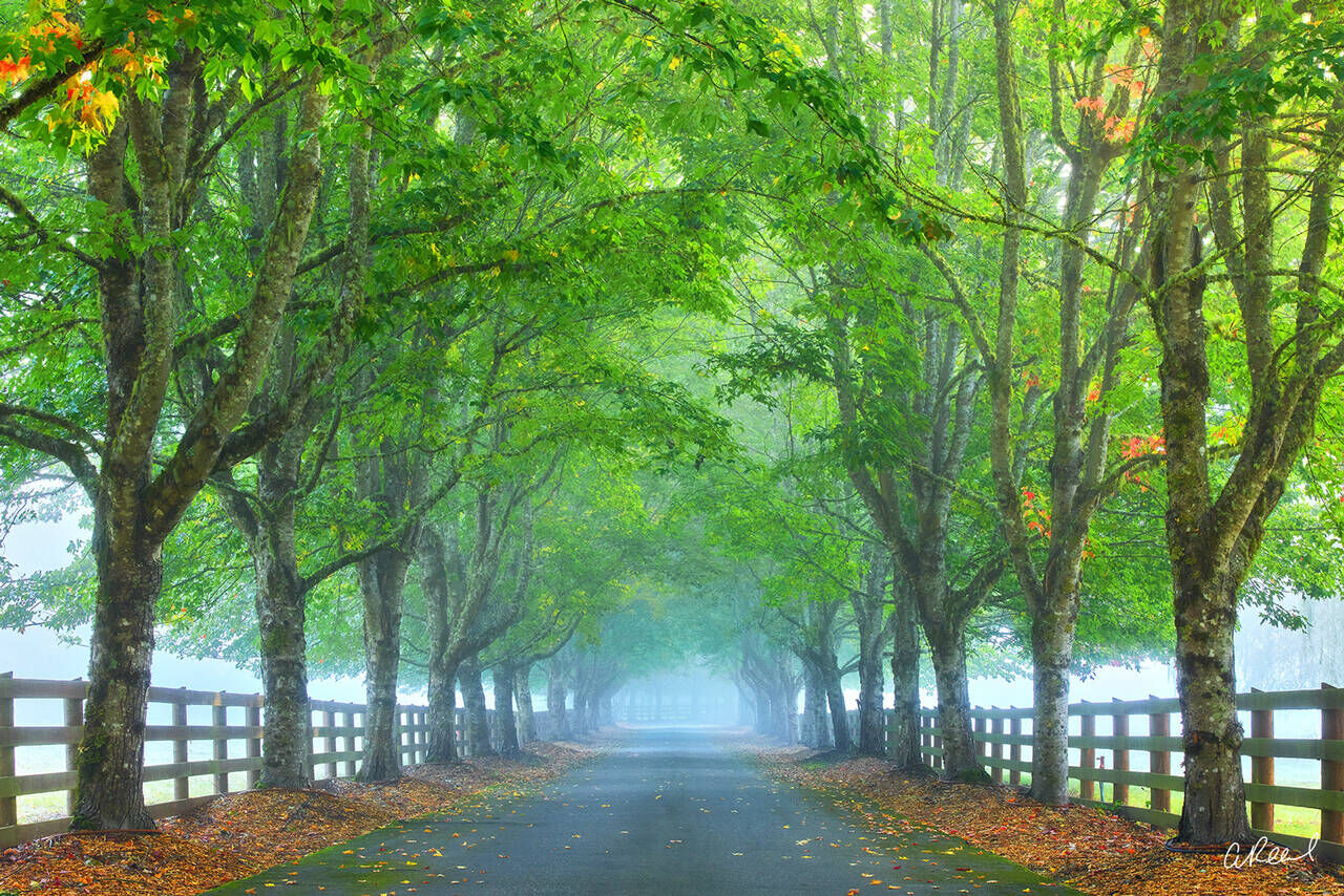 A tangled web of skeletal branches lace together the ashen trunks of a grove of aspen near Leavenworth, Washington. Unfazed as yet by the chill of winter, the fiery hues of the autumn undergrowth bleed through a hush of fog. Fine Art Limited Edition of 100.