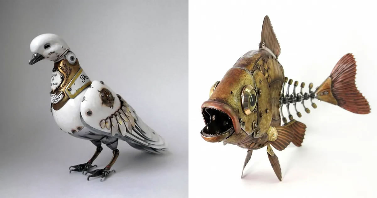 Russian artist Igor Verniy creates steampunk animal and insect sculptures. He creates these sculptures with heaps of scrap metal, old bike chains, and silverware. Igor creates various sculptures like animals, insects, birds, and sea creatures, in the steampunk style.