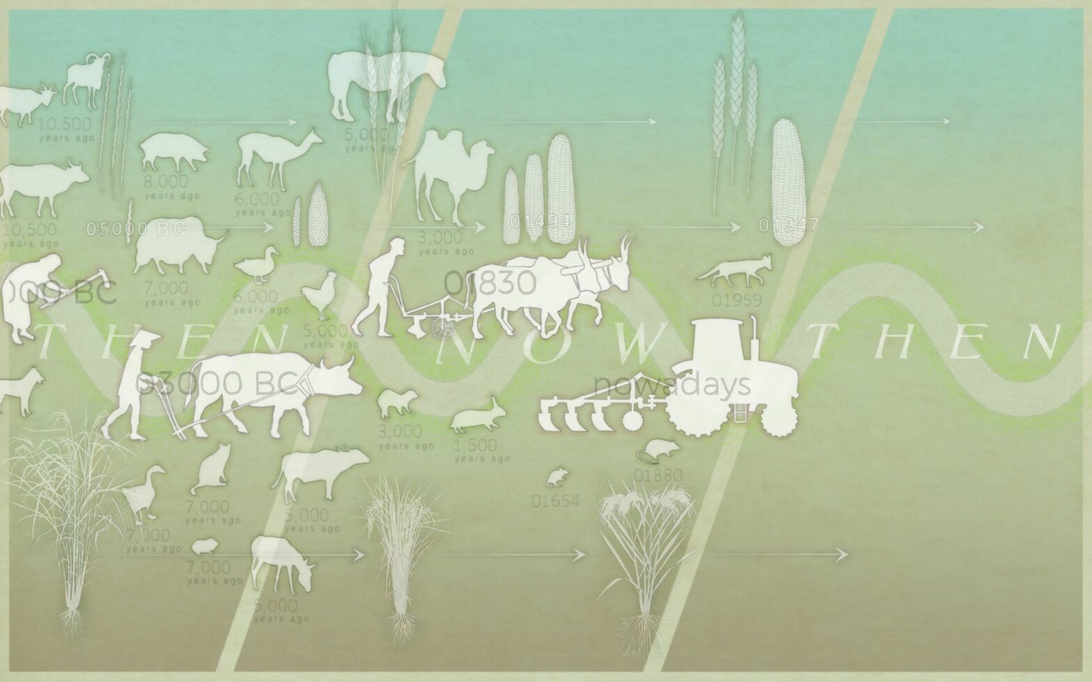 The advent of farming in the Middle East 10,000 years ago, often thought of as a pivotal change in how humans interacted with and shaped their environments, could instead be a continuation of an ancient pattern of behavior stretching back 300,000 years or more. The common image of this change depicts passive hunter gatherers following herds of animals around the grasslands of the Levant, when suddenly someone had a eureka moment and decided that instead of being helpless subjects of their environments, they would take control and grow the food they need from the seeds of grasses (i.e., grains). In reality the grassland they lived in probably existed in part due to their intentional burning, and genetic evidence suggests that humans started influencing the evolution of wheat and barley 30,000 and 20,000 years ago respectively,17 predating the agricultural revolution by 10-20,000 years. So rather than farming being a complete change in how humans behave, instead it could be viewed simply as an intensification of one of our natural behaviors.