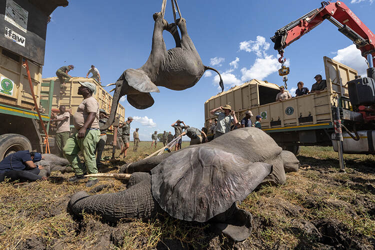 Marcus Westberg’s Airborne shows elephants being moved from Liwonde National Park to Kasungu National Park, Malawi, under the supervision of conservation specialists.