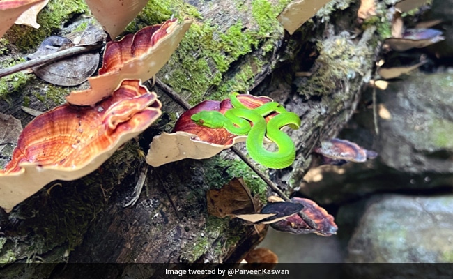 On  Monday, he tweeted a picture of a Green Pit Viper nestled between wild mushrooms. The tiny and green snake stands out amidst the mushrooms because of its bright colour, and it definitely looks beautiful. Mr Kaswan wrote, “I was just observing the mushrooms. Suddenly found this beauty. They look so unreal and colourful. Can stay for hours like this. During a long field walk. Called as Green Pit viper.”