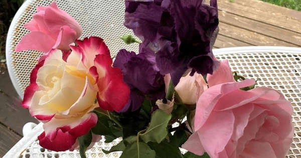 SAN LEANDRO, CA — A bearded iris nestles amidst roses in this bouquet picked Saturday by Miyo Burnett.