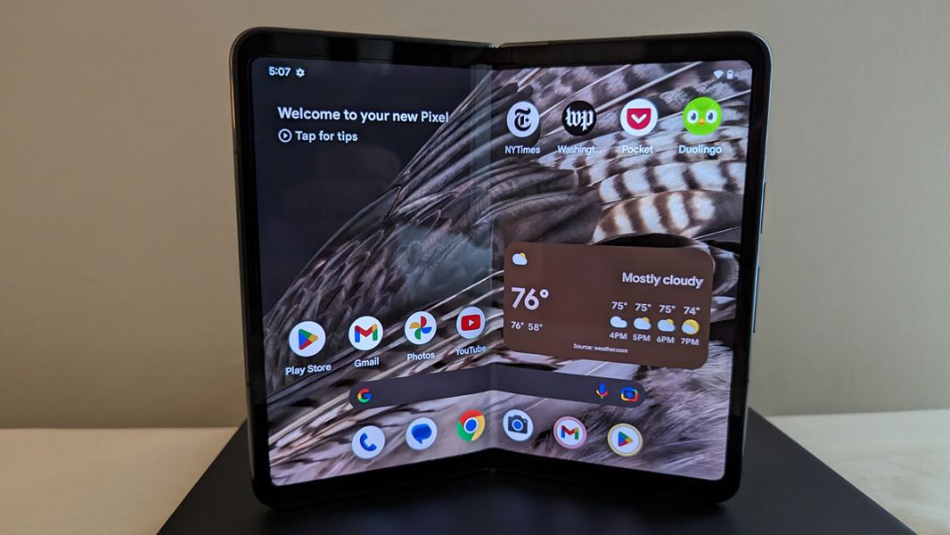 In real-world terms, this means that the Pixel Fold is thin—about half an inch or so—for a folding phone while closed, making it feel less chunky and awkward than Samsung’s offerings, and easily pocketable. It also closes flat, with no air gap, and because it features the instant classic Pixel camera bar across its back, you can use it normally, if slightly angled, on a table when closed. (When open, you get some wobble.) And the outside display, while small at just 5.8 inches, mostly fills up the exterior of the device, and is not oddly tall and thin like Samsung’s, helping it look and feel more natural as a smartphone.