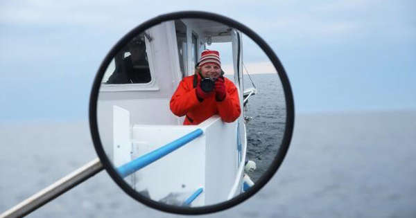 Julie D’Amour-Léger takes a selfie on a crab boat. Her love for photography started at the age of 12 when she got her first 35-mm camera.