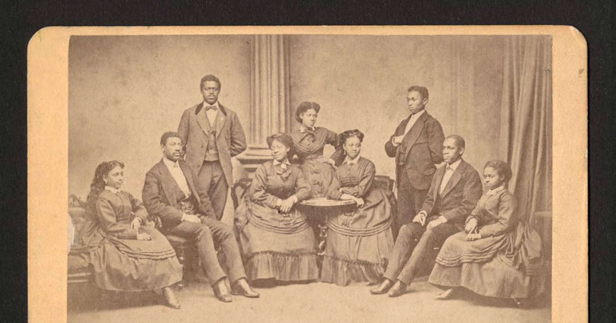 Jubilee singers at Fisk University, in Nashville, Tennessee, pose for promotional photograph, circa 1871.
