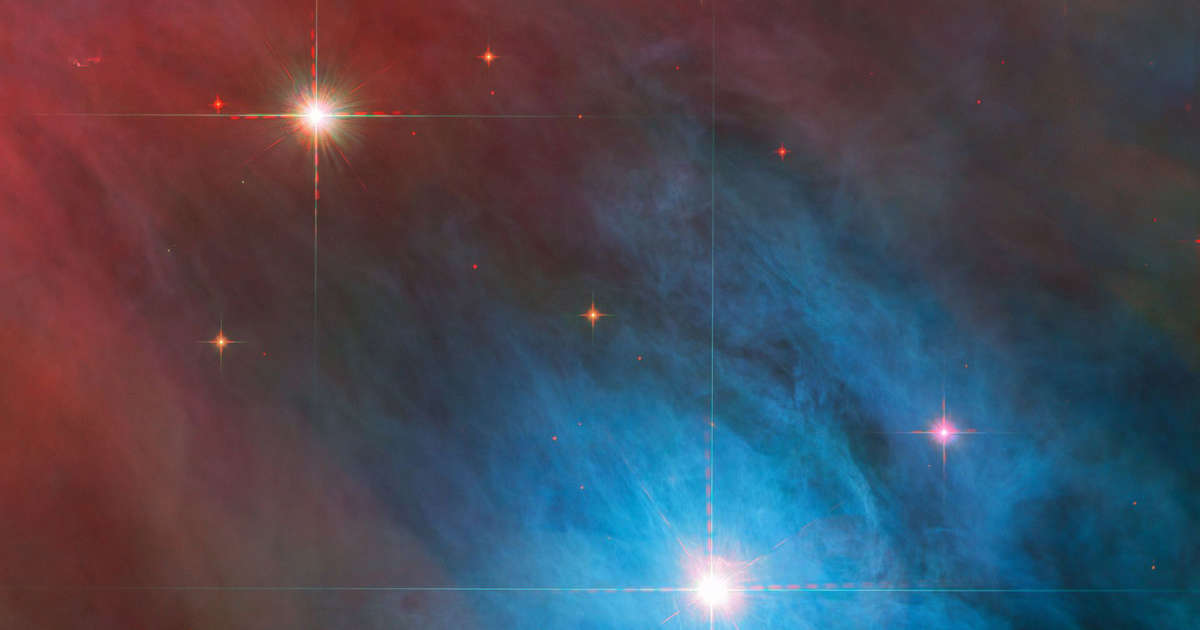 In the new Hubble image, which ESA released online on Jan. 23, the two prominent stars are surrounded by smaller red stars.The background of the image is blanketed by bright blue and wispy red clouds of gas, which provide the elements for future star formation.