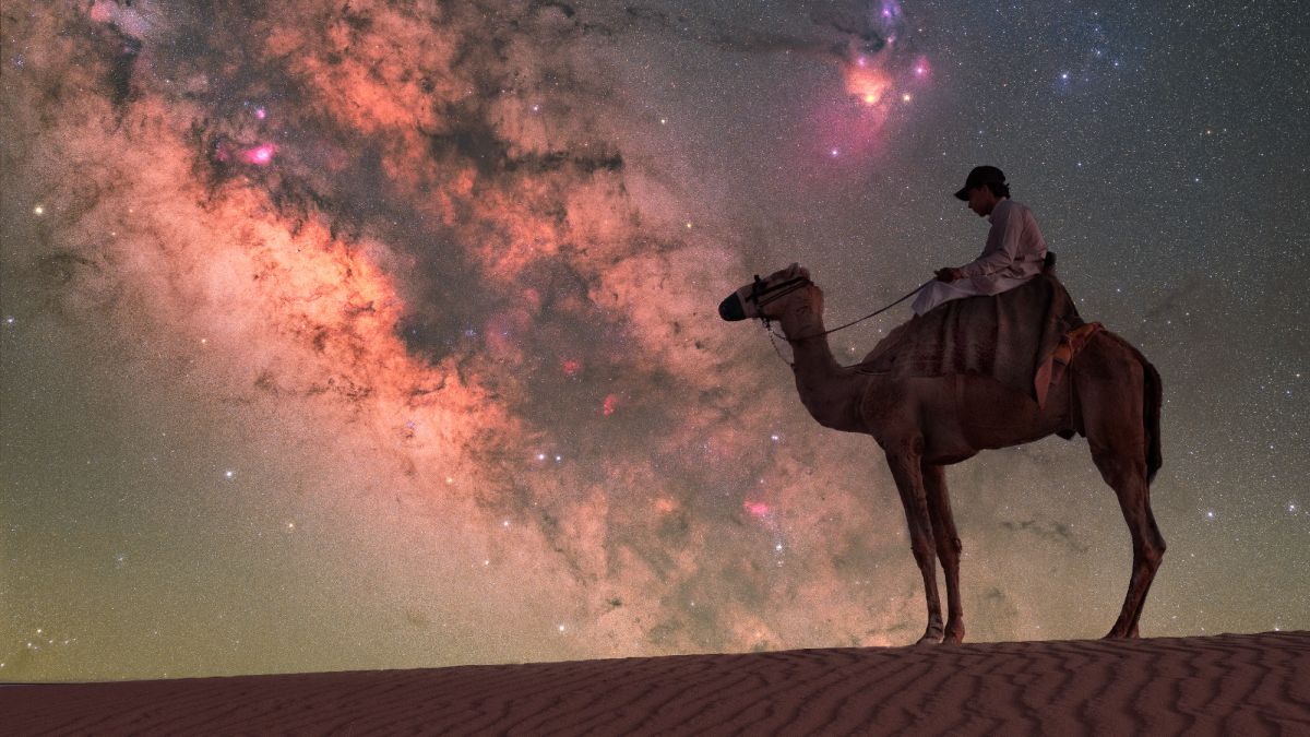 Person on a camel in the desert in front of the Milky Way