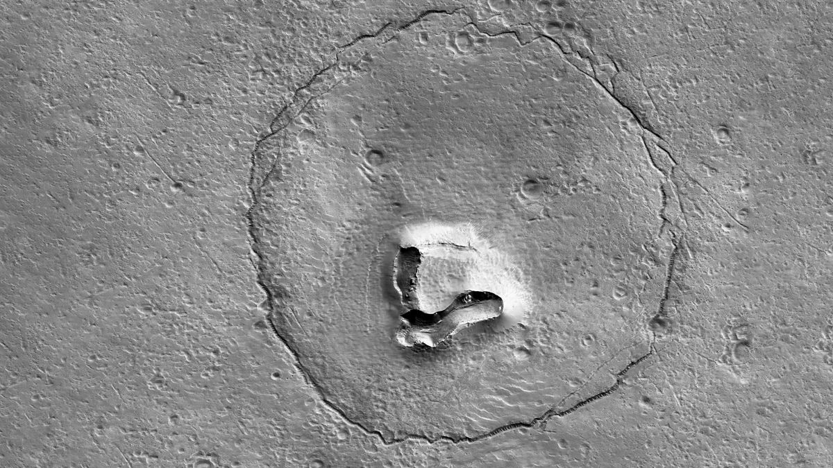 While the latest image doesn’t exactly prove that life on Mars ever existed, it does show a view of the planet’s surface that hasn’t been seen before. The bear-like face is made up of a circular fracture complete with two shallow craters that resemble eyes. In the middle of the circle, a V-shaped crevice atop a lighter patch creates the outline of the bear’s nose.