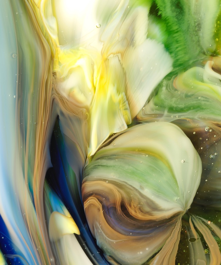 Lyon works in fused and stained glass and has developed a distinctive photographic style by using a macro lens to explore some of her glass creations. The resulting abstract photographs are mostly printed on metal to enrich the colors and brightness, and fabrics created from the photos are turned into table linens, scarves and bags.