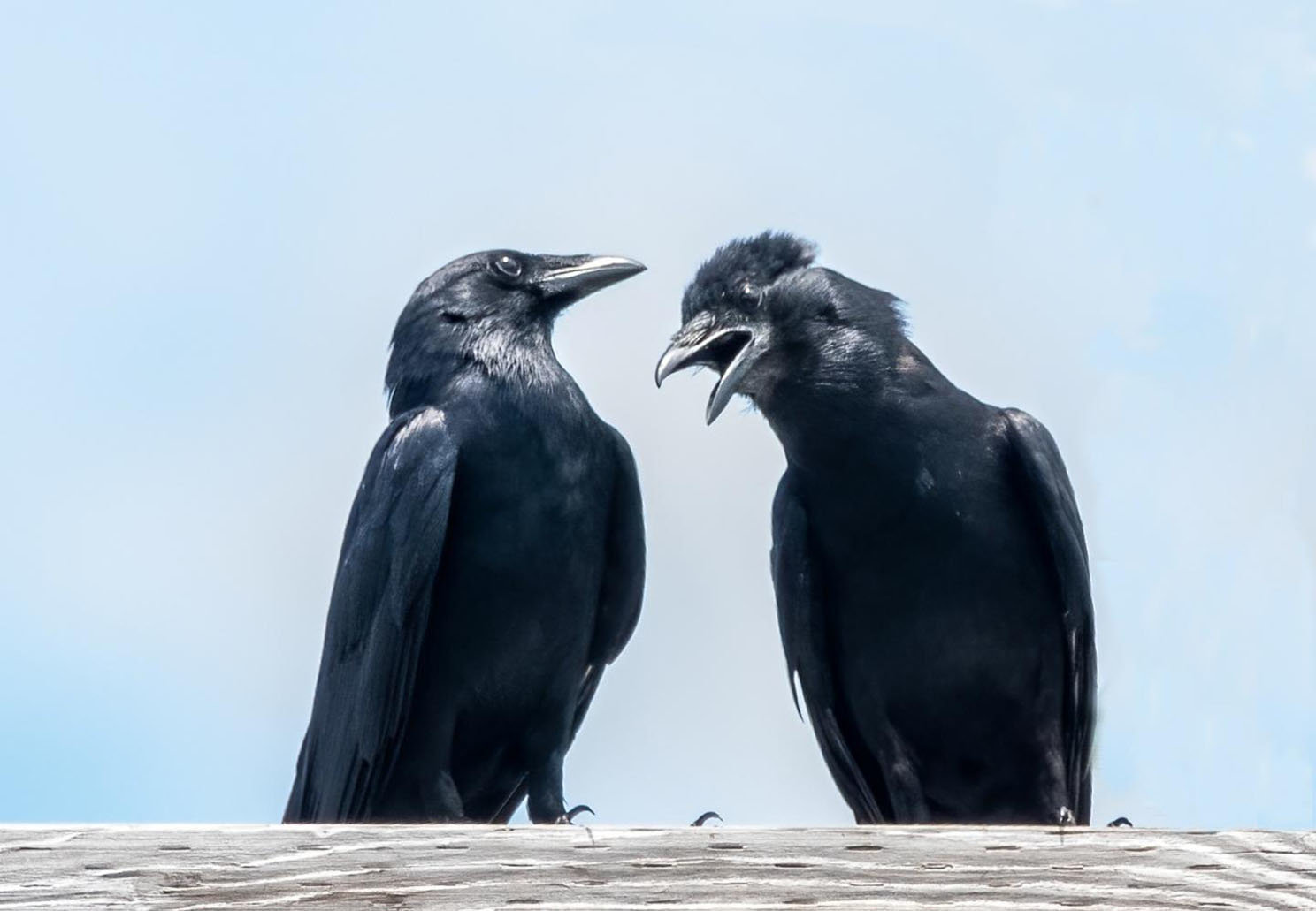 It is called “Corvid Conversation” and shows what appears to be an animated discussion between two crows. Corvid is a term referring to the crow family, which is why Mr. Licata chose that title.
