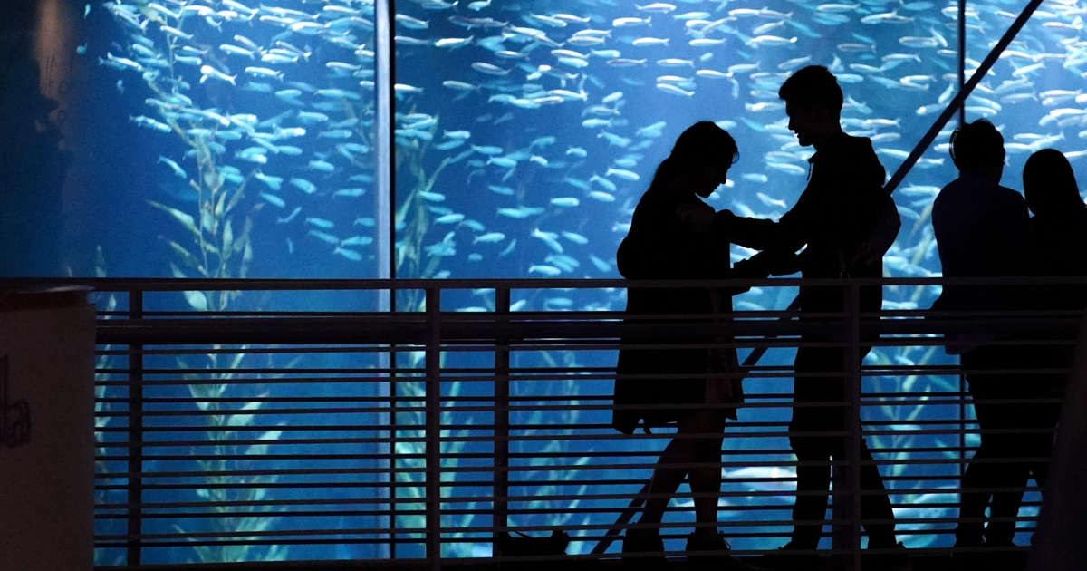 A couple on a bridge dances to live music in front of the Blue Cavern tank at the Aquarium of the Pacific in Long Beach on Friday, Feb. 15, 2019. The Aquarium is celebrating New Year’s Eve with a daytime event aimed at young kids this year.