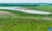 This aerial photo taken on May 19, 2023 shows milu deer at Shishou Milu Deer National Nature Reserve in central China’s Hubei Province. After years of efforts by protectors and continuous improvement of the local ecological environment, the population of milu deer at the nature reserve has increased rapidly. (Xinhua/Hui Xiaoyong)