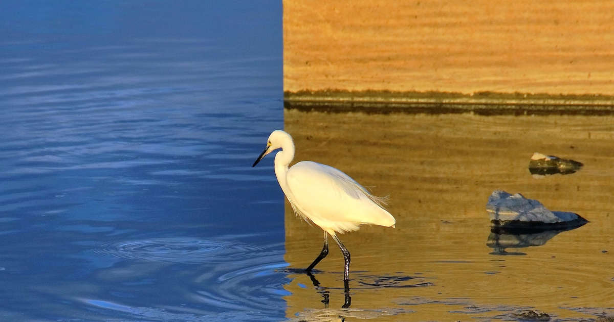 It shows an egret wading in the shallow water, with a concrete wall behind it casting a shadow on the lake.