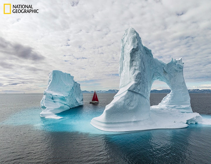 Five weeks into the journey of the National Geographic expedition ship Polar Sun, photographer Renan Ozturk found himself exploring a bay off the coast of Greenland. The boat played peekaboo with pale blue icebergs as Ozturk readied his camera drone and held his breath.