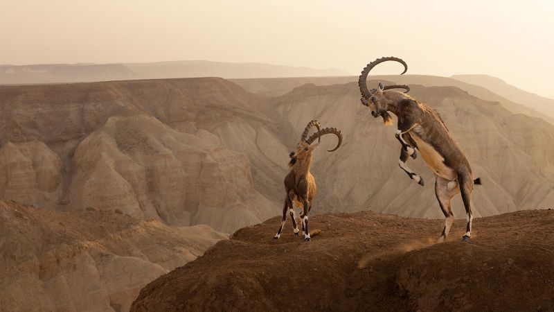 Other winning images include rarer wildlife sightings, such as a pair of agitated mountain goats locking horns in a cinematic rocky landscape. In the “Wildscape & Animals in Their Habitat” category, photographer Amit Eshel traveled to Israel’s Zin Desert to capture the two male Nubian ibexes in a heated face-off during rutting season.
