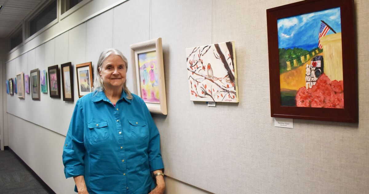 Artist Sue Robertson standing near her paintings and photographs displayed in the Rancho Bernardo Library.