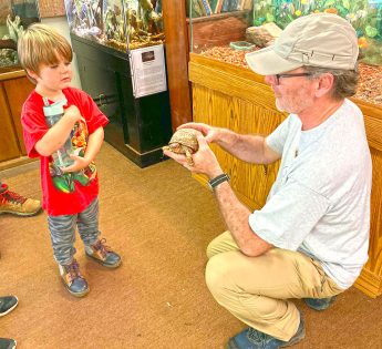 PHOTO CAP: Five Mile Woods Naturalist John Heilferty shows a box turtle to one of their guests.