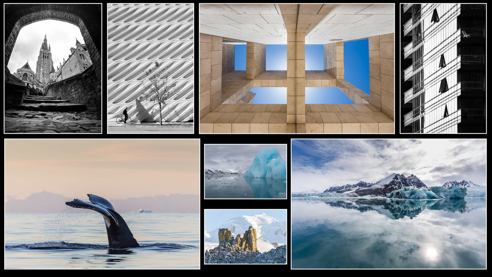 Bottom row, clockwise l-r: Whale Fluke, Antarctica, Arctic Iceberg and Mountains, Arctic Reflections, Half Moon Island, Antarctica