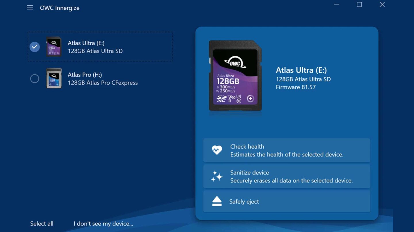OWC’s Innergize is a custom-designed app that features a complete health suite for your Atlas memory cards and does everything from checking performance, enabling you to upgrade firmware, and ensuring that the cards perform at the same level they did when they were new.