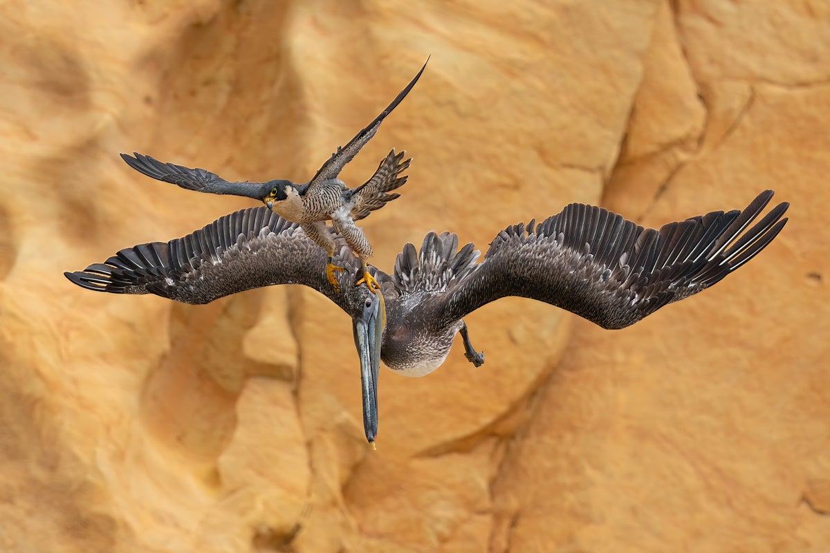 In the prize-winning image taken by Photographer Jack Zhi, from the US, the falcon is seen tackling a brown pelican that ventured too close to its nest.