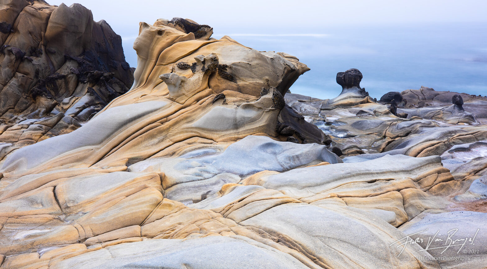Bizarre sandstone shapes etched by millennia of wind, salt, and rain in Salt Point State Park, on California’s Pacific Coast. I used a long exposure (30 seconds) in this photograph to blur the misty sea to accentuate the strange figures.