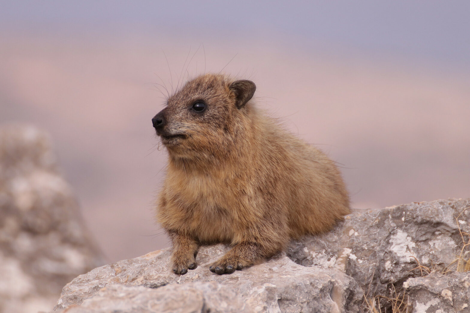 On my first visit to the nature reserve quite some years ago, I saw what looked like a small koala bear, but clearly that wouldn’t have been possible unless it had been a remarkable swimmer or had escaped from a zoo. I subsequently discovered, as I got closer to it, that it was a Syrian rock hyrax, which is one of the most intriguing animals that reside in Israel. It’s a small animal, perhaps about 50 centimeters long, but its gestation period is six or seven months, which is very long for its size. Compare this to a fox which is somewhat bigger than the hyrax and produces its young in just 50 to 60 days, or to the rabbit, which is a little smaller than the hyrax and has a gestation period of about a month. Curious though this is, it’s not the most fascinating aspect of a hyrax. What is almost unbelievable is that the hyrax’s nearest family member in the animal kingdom is the elephant. Almost unbelievable it might be, but true it is. Despite seeing hyraxes on quite a regular basis I still get that same thrill in observing them as I did when I saw my first koala-like little animal friend.