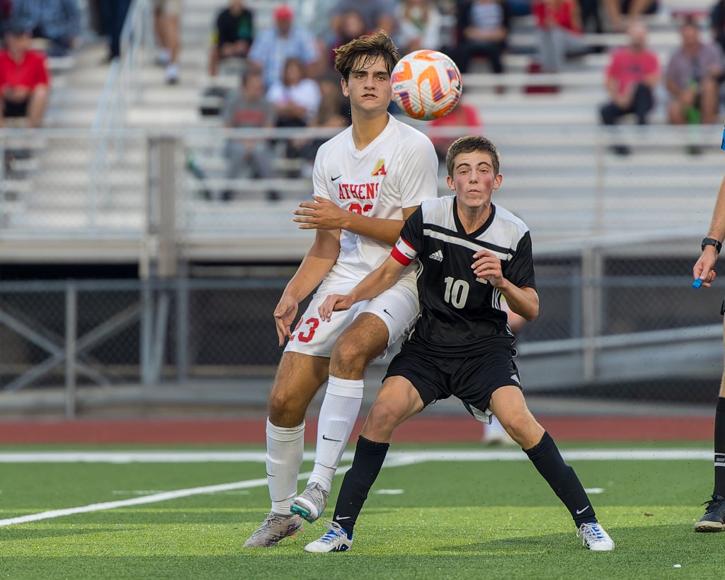 Troy Athens’ Daniel Kadiu and Troy’s Clay Cusmano battle for the ball in a 3-1 Red Hawks victory that was called due to weather with 24:12 left on the clock Tuesday, Aug. 29, 2023 in Troy. (TIMOTHY — For MediaNews Group)