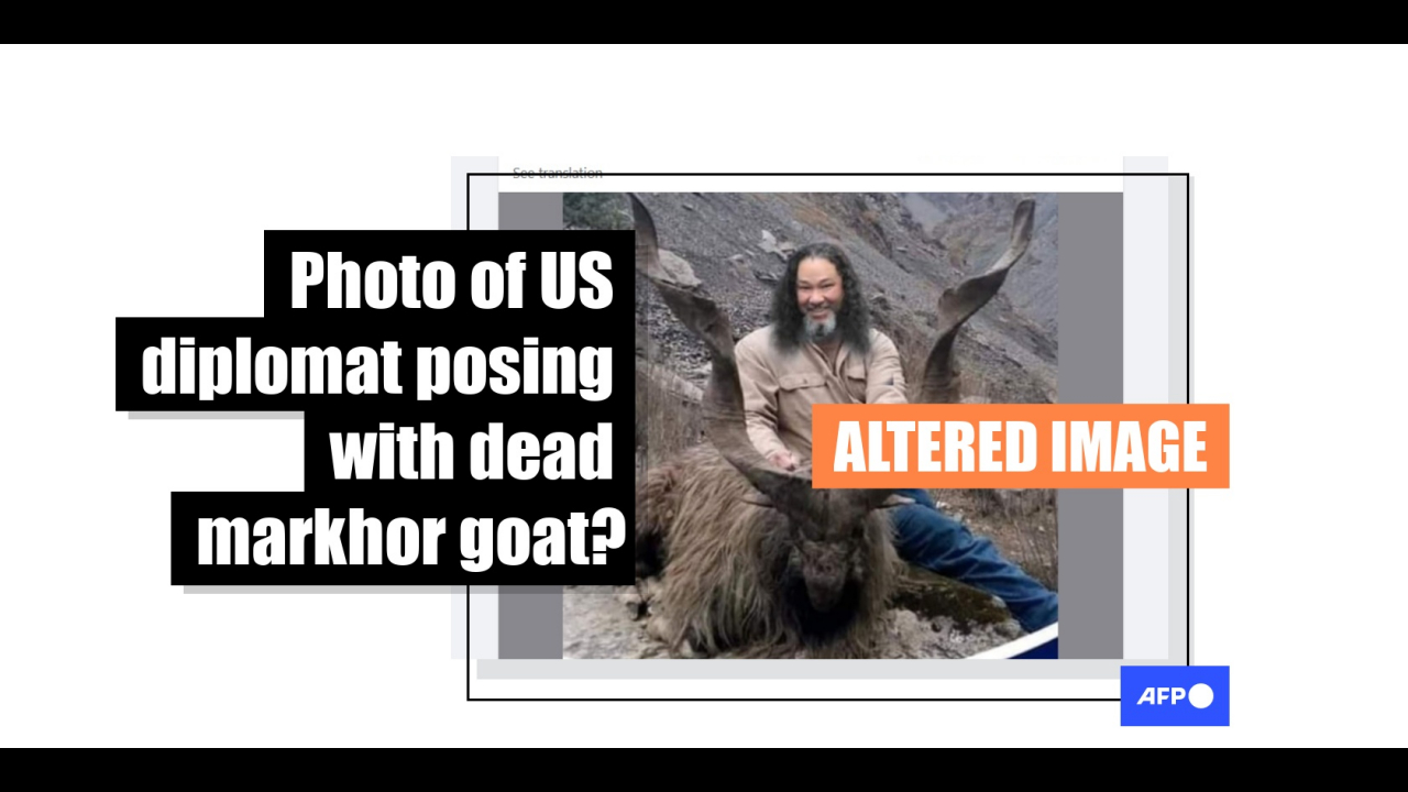 A doctored image has been repeatedly shared in Urdu-language tweets and Facebook posts that falsely claim it shows the “US ambassador to Pakistan” posing after hunting Pakistan’s national animal, the markhor goat. The original photo has appeared in multiple reports about an American man who supposedly paid tens of thousands of dollars to hunt the markhor in Pakistan. This photo had been digitally altered to insert the image of the US consul general in Lahore — not the US ambassador as the posts claim.