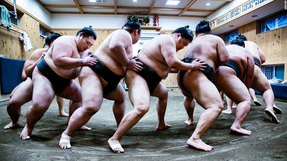 Wrestlers partake in a practice drill at their “beya,” a stable where the athletes live and train. Credit: Lord K2