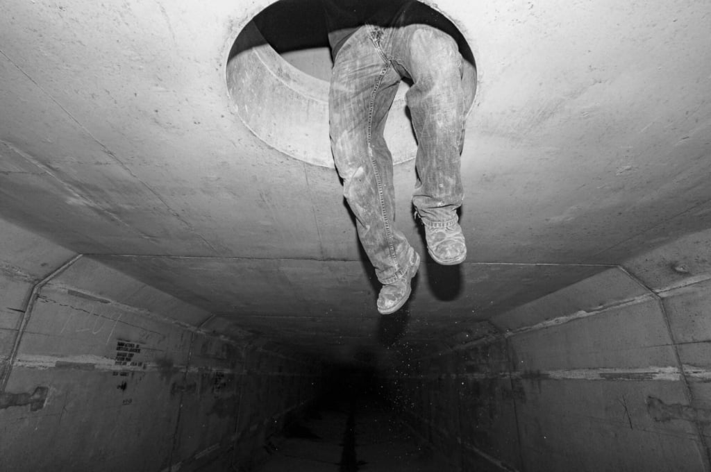Gervin also prowls the city’s subterranean tunnels. His shot of a man’s legs dangling from a manhole cover as he enters or leaves a tunnel, is enlarged here to wall size. It’s nice to see these prints in bigger scale – many of which I’ve seen developed in smaller format at The Bakery Photo Collective, where he is executive director, or in his beautifully bound book, “Portlanders,” on sale at 82Parris or through his website.