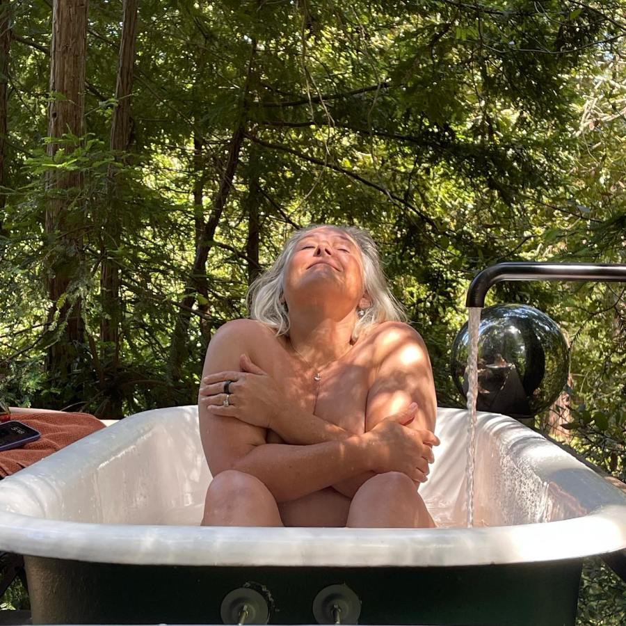 In the snap, the former talk show host crossed her arms over her bare chest while sitting in a bathtub in the middle of the woods. She leaned back and had a big smile on her face as she enjoyed the great outdoors with her husband, Ross Burningham.