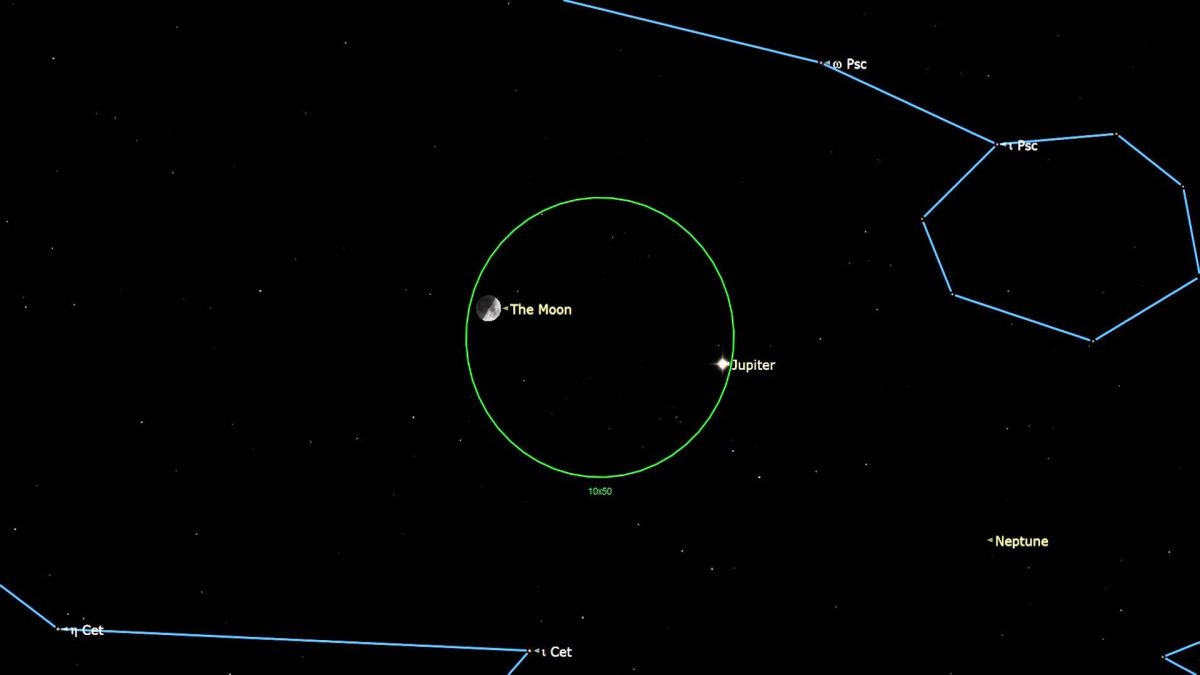 The final first quarter moon will be joined by a special guest tonight: Jupiter, the solar system’s largest planet. Both will be visible in the southern skies in the constellation Pisces and should be close enough together to see with a pair of binoculars (though will be too far apart to see with a telescope). Jupiter and the moon will be in conjunction, meaning they share the same right ascension, the celestial equivalent of longitude.