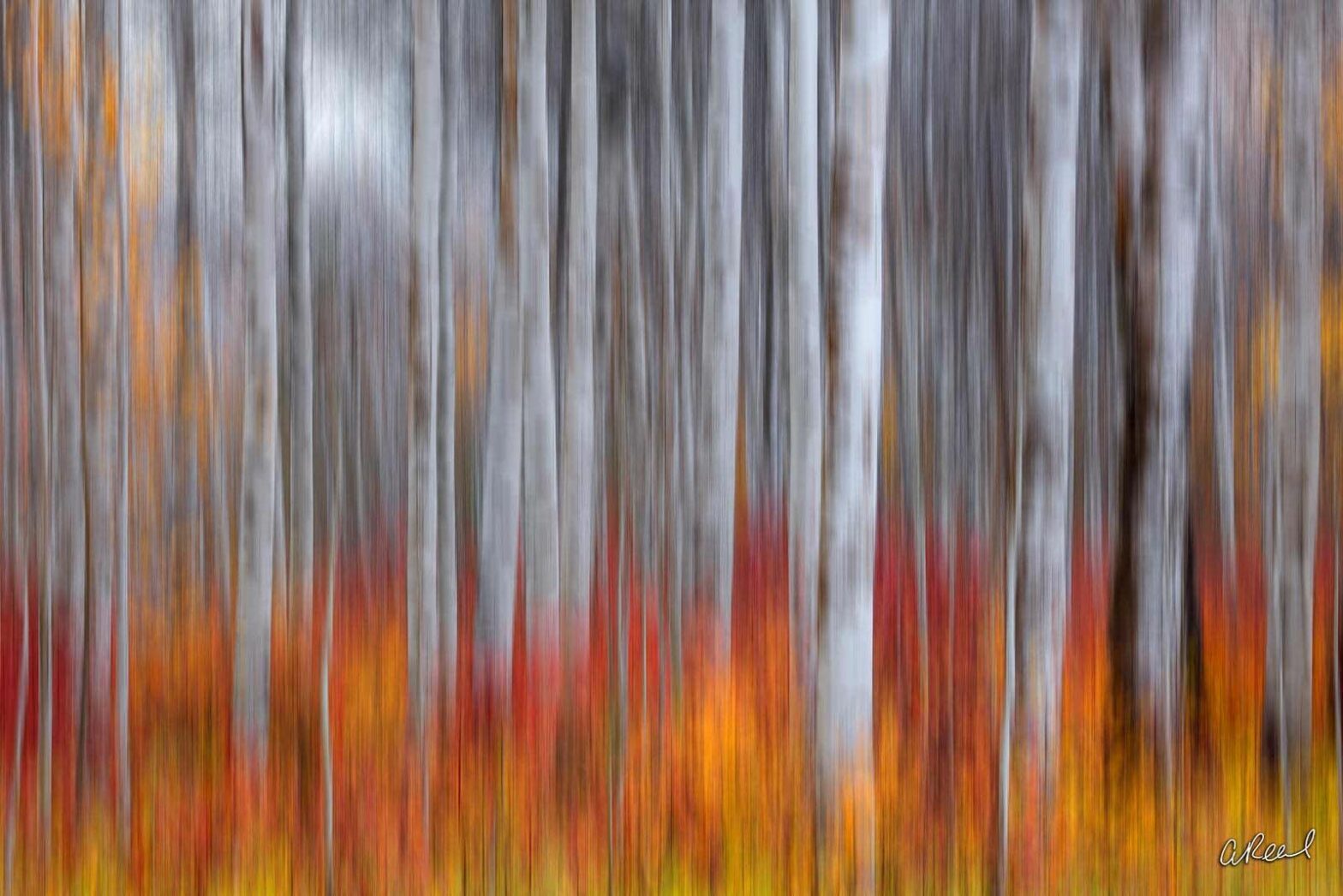 A dense grove of aspen, suffused by a parade of bright gold and scarlet in the heart of winter is transformed by sudden motion. The fecund undergrowth becomes a raging brushfire snarling the grecian fantasy of floating columns like an animate miasma. Fine Art Limited Edition of 50.