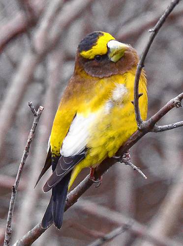 I am sure that some of you may have looked at today’s photo and thought, “That’s not a plant.” I know that I had made a New Year’s resolution to focus more attention on plants this year, but Nature herself threw me a curveball when this gorgeous male evening grosbeak (Coccothraustesvespertinus) appeared on my deck last week. I promise to make up for this in May with an extra plant column, but I simply could not ignore this amazing sighting.