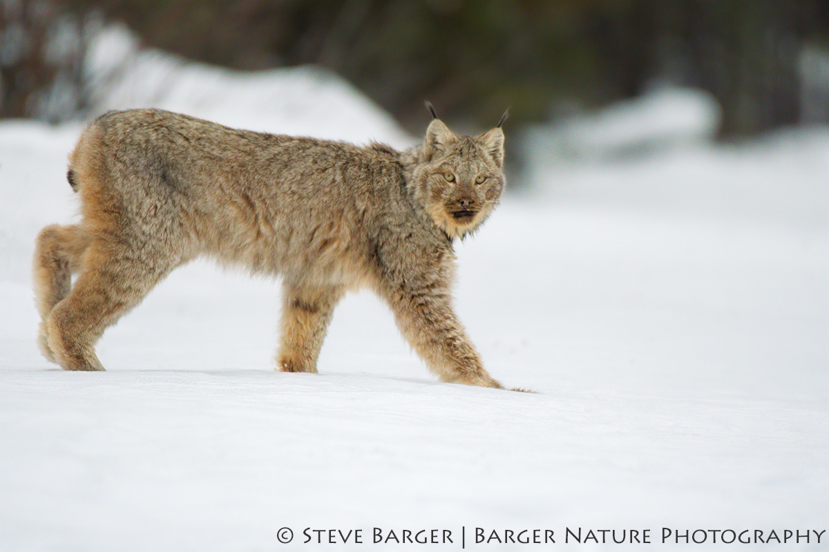 The riviting gaze of a lynx as he walks out of the forest and onto a remote logging road in British Columbia