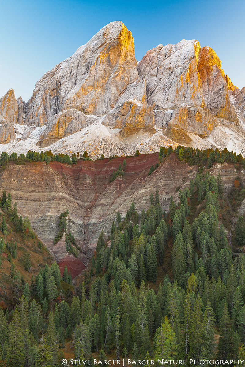 The next day we returned to the exact same location and the weather was sunny. I was completely blown away by the scenery. I found the scenery more spectacular than described by our guides. The image seen here is of Mt Sass de Putia bathed in the golden light as the sun set. I especially like the mix of warm and cool tones. The color in the cool blue sky and the golden light on the mountain peaks complement each other nicely. My camera did an excellent job of holding detail in the spruce trees. I hope you enjoy this image.