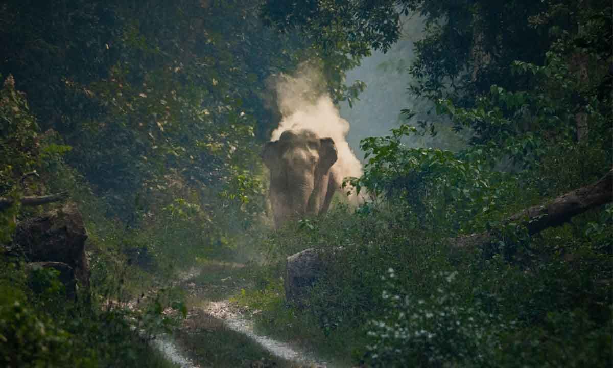 The image captured a stunning sight of an elephant, in the middle of a densely forested region, surrounded by nothing but wild nature. The tusk looked menacingly beautiful in the photo standing powerfully in the center, a cloud of dusty smoke billowing up behind the animal. Ahead of the elephant, there was a narrow path, probably left by safari jeeps, leading deeper into the forest. The minimalist yet striking play of colors in the image, which comprises shades of green, brown and grey, shows the complexity of the shot as it is taken.
