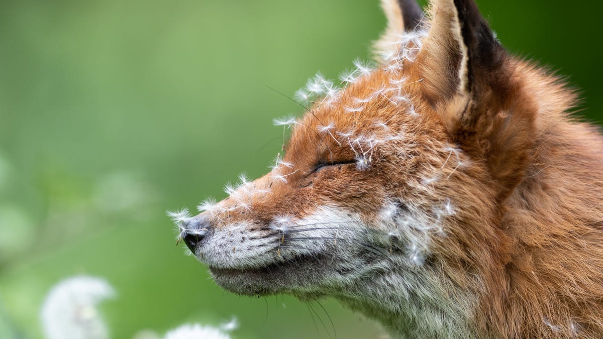 A female fox covered in dandelion pappi.Photo: Lewis Newman