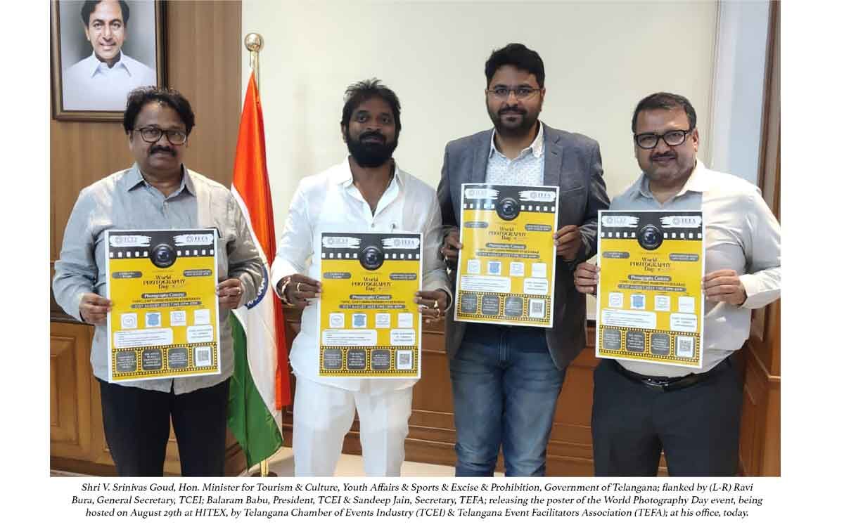The Telangana Chamber of Events Industry (TCEI) – India’s largest regional events association; along with its constituent association Telangana Event Facilitators Association (TEFA); is hosting World Photography Day on August 29th at HITEX Exhibition Center, Hyderabad. Shri V. Srinivas Goud, Hon. Minister for Tourism & Culture, Youth Affairs & Sports & Excise & Prohibition, Government of Telangana; released the poster of the World Photography Day event, today at his office, Balaram Babu, President, TCEI; Ravi Bura, General Secretary, TCEI and Sandeep Jain, Secretary, TEFA; were present on the occasion.
