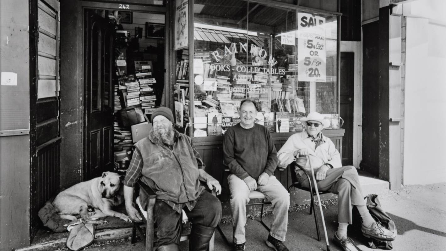 And although he’s behind the camera, these are all environments where Ross is a part of the community or a friend to his subject. This familiar association is apparent in his works. There is a quiet sympathy present in his photographs. You can appreciate this in the images where Ross’ subjects meet the camera with a sense of ease, and the trust and faith they have in their photographer’s perspective is plain to see. One such image is that of Rainbow Books on Riddiford St, Newtown, where the bookstore owner Brian Stenner and dog Tag sit proudly in front of the teeming bookstore alongside friends, Lindsey and Gordon.