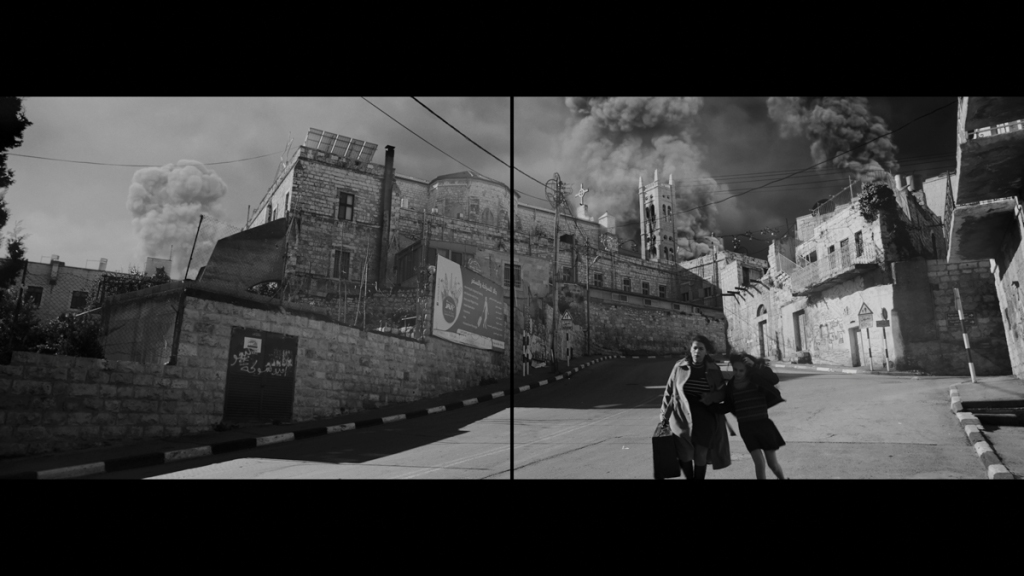 Seeming to offer dictionary definitions without their accompanying headwords, and alphabetical lists of words without their attendant meanings, the film makes sometimes associative, sometimes arbitrary connections between the utterances, leaving the viewer struggling to grasp the relation between word and image. The voiceover begins to stutter, “ba-ba-baba-babel-babe-babel-baboon,” yielding other words: barbarism, barrier, barricade. The camera moves to locations outside the city center, including what appears to be a fortified Israeli settlement atop a hill. Papers nailed to trees presumably providing official notification—of eviction? destruction?—flutter in the distance. Shops and grocery stores close for business well before dark, likely as curfew is imposed. The m* in the title—the asterisk is a reference to the star of Bethlehem—could refer to a truncated map or withheld meaning.