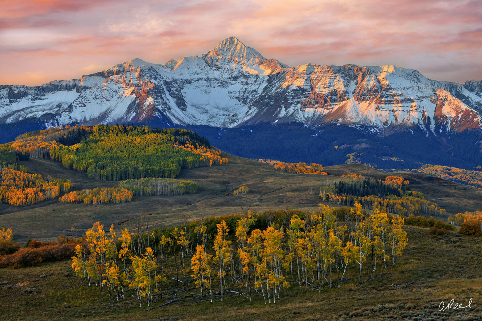 The first light of day kisses the snow covered peaks of the Rocky Mountains outside Telluride, Colorado on a cool autumn morning. Fine Art Limited Edition of 50.
