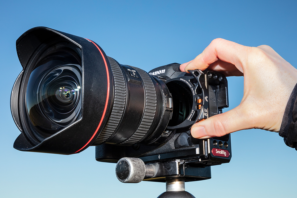 Inserting Breakthrough Filters’ 10-stop ND into Canon EF-EOS R adapter on EOS R5 with EF11-24mm f4L attached