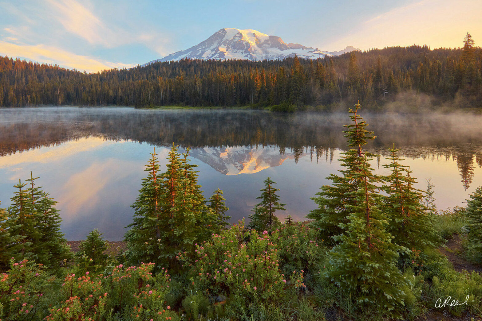 A rush of clear water races down from the forbidden peaks of a range of misty mountains. Along the rocky banks, flashes of gold announce the arrival of autumn to the high places. Fine Art Limited Edition of 50.