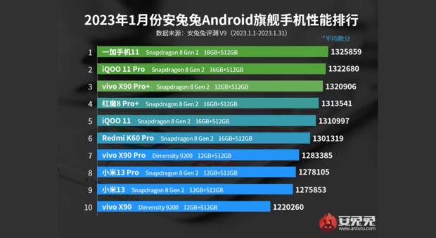 vivo has once again brought its A-game to the table as it dominates Antutu’s January 2023 chart, with its flagship vivo X90 Series securing 3 spots in the top 10 best-performing flagship smartphones in China list and its sub-brand iQOO 11 Series landing 2 spots in the same chart. The vivo X90 Pro+, vivo X90 Pro, and vivo X90 secured Antutu’s 3rd, 7th, and 10th rankings, respectively while iQOO 11 Pro and iQOO 11 held the 2nd and 5th spots.