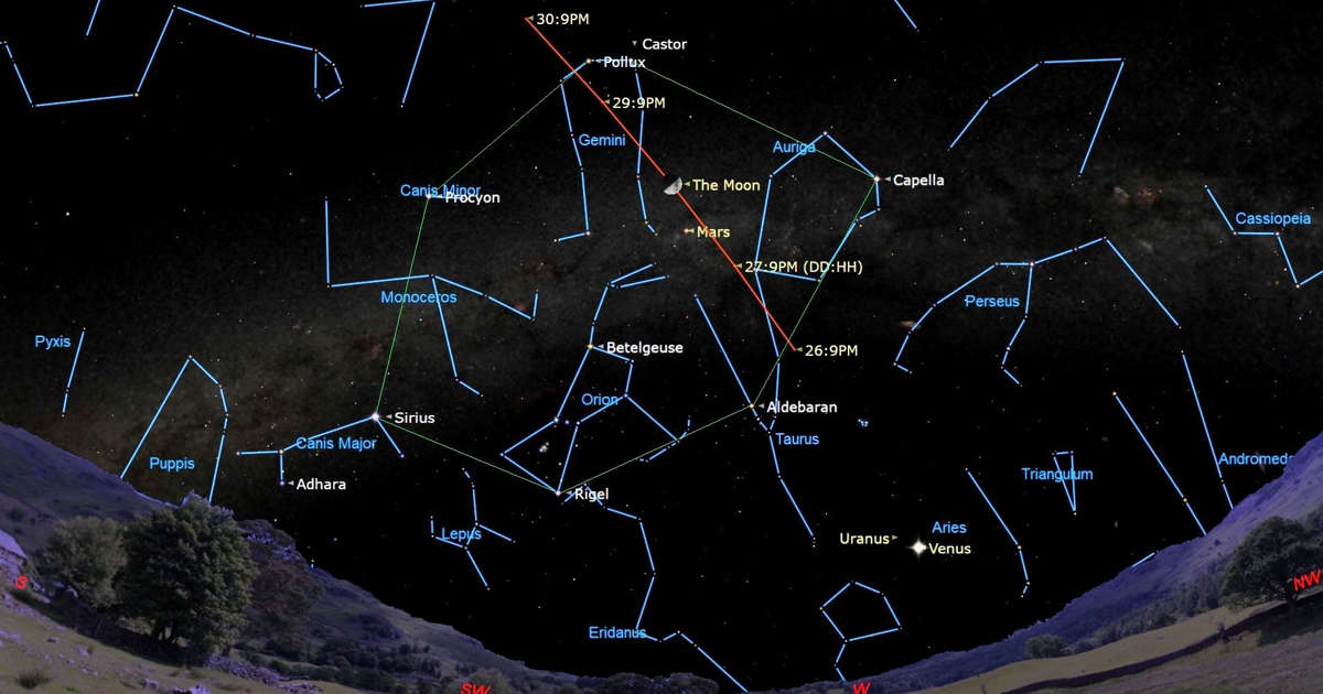 Both Mars and the moon will be in the Gemini constellation on Tuesday evening. From New York City, the pair should be visible high to the south as soon as the skies darken enough for Mars to be visible. The Red Planet and the moon will be separated by just 2 degrees (the width of your fist at arm’s length equals roughly ten degrees) and both will set to the west just after 2 a.m. EDT (0600 GMT) on March 29.
